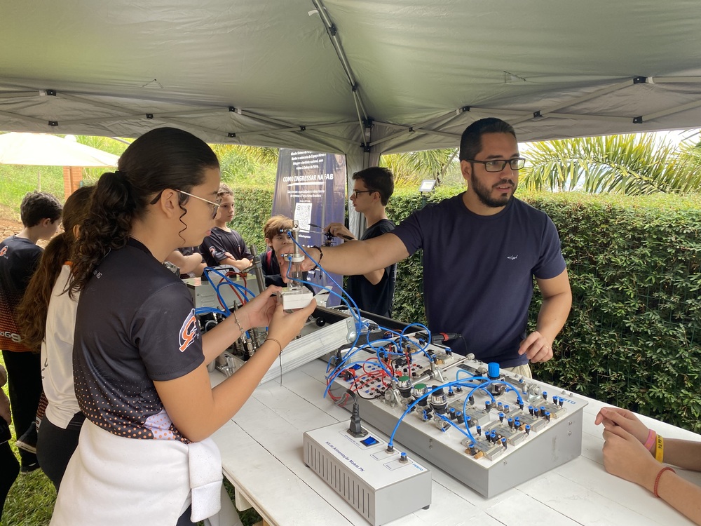 O professor Dr. Yohan Ali Diaz Mendes, coordenador do curso de Engenharia Mecânica e Aeronáutica da Unifei, juntamente com estudantes da instituição, apresentaram ao público a mecânica das aeronaves, com a apresentação de atuadores, turbina, superfícies de controle, drones e outros componentes.